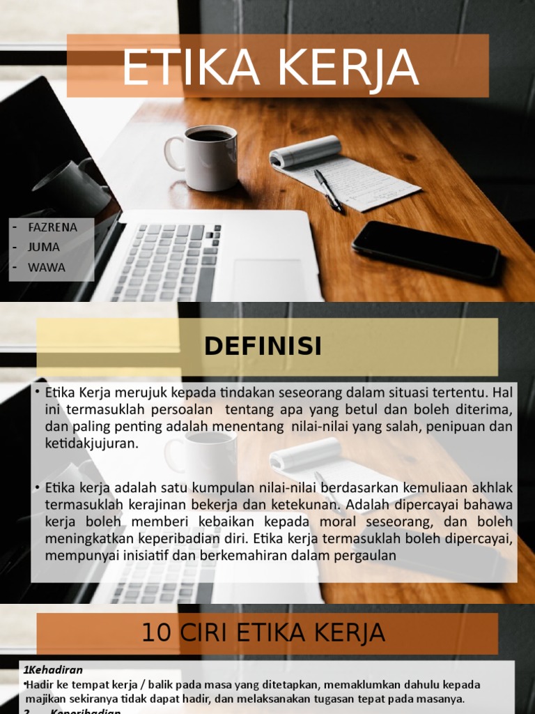 Perkataan etika berasal dari perkataan Yunani Kuno iaitu ethos yang bermaksud watak. Pengertian etika kerja adalah norma nilai dan aturan yang menjadi pedoman karyawan dalam bekerja. ETIKA KERJA - FAZRENA - JUMA - WAWA DEFINISI Etika Kerja merujuk kepada tindakan seseorang dalam situasi tertentu.